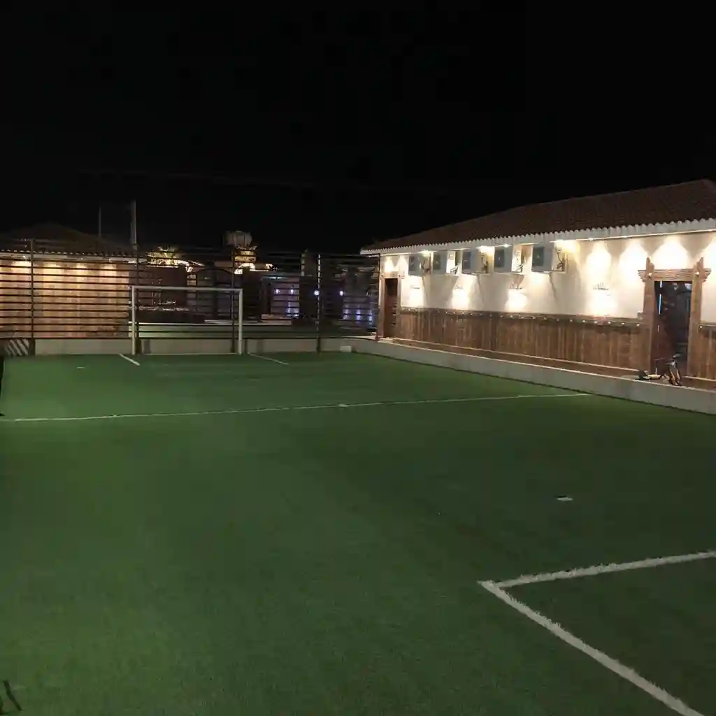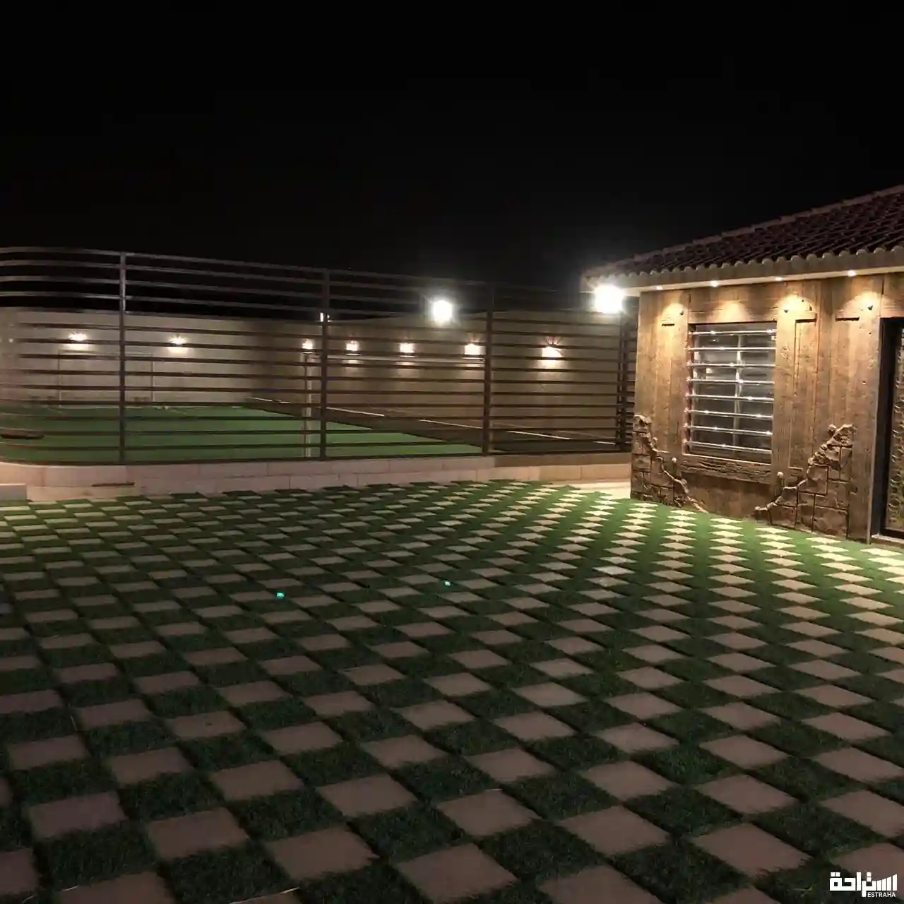 شاليه يتكون من مجلس ارضي شعبي يسع 25 شخص وجلسة خارجية بمضلة تسع 8 اشخاص وملعب كرة قدم يتحول لطائره ودورتين مياه ومطبخ صغير متكامل ومدخل سياره
