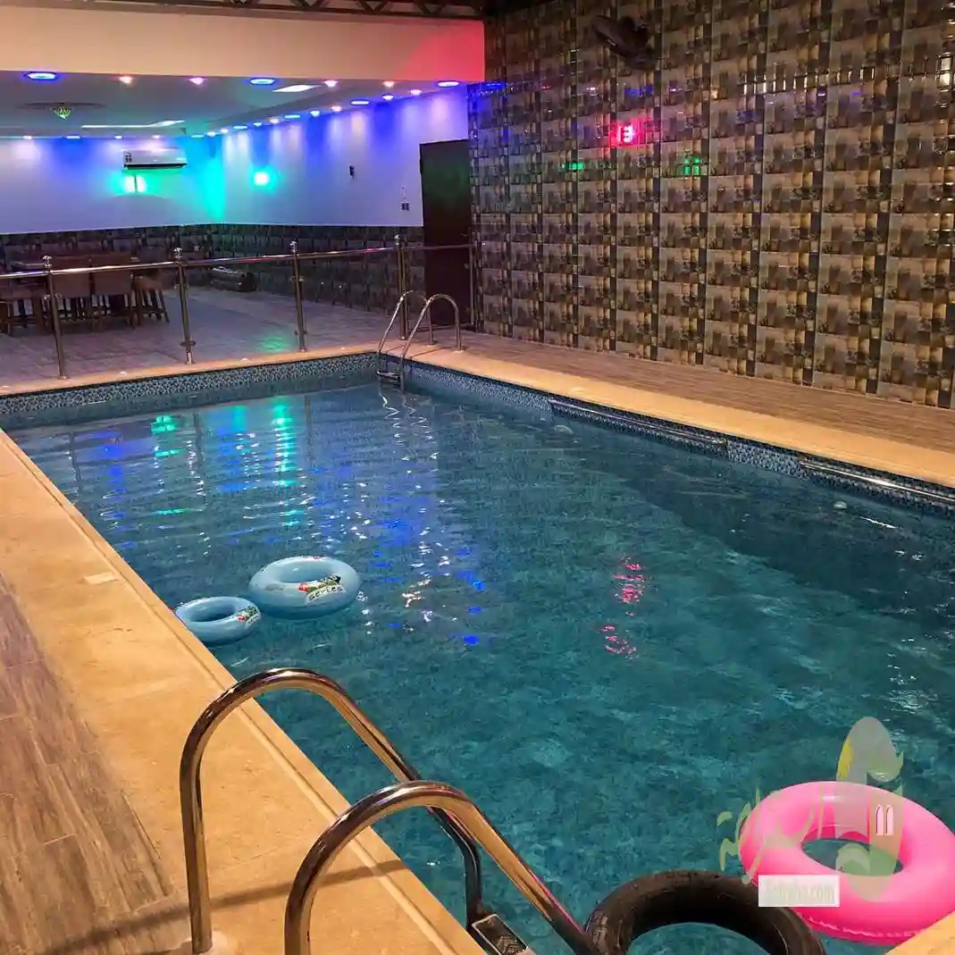 شاليه يتكون من مجلس تراثية ارضية يسع 20 شخص ومجلس كنب يسع 11 شخص وغرفتين نوم و 2 دورات مياه ومطبخ متكامل وجلسة خارجية بمظلة تسع 8 اشخاص ومساحة خظراء والعاب اطفال و مسبح داخلي بمضله وحاجز العمق متدرج متر لمترين الطول 9 العرض 4