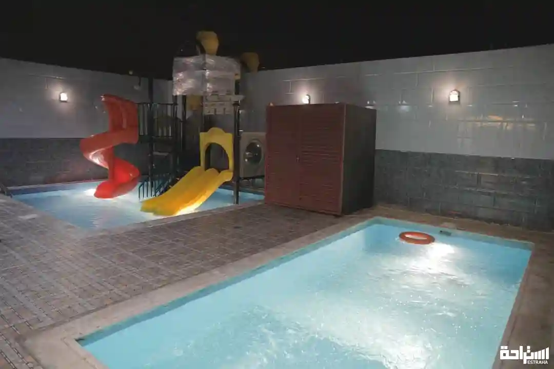 ▫️- صالة كبيرة ▫️- غرفتين نوم ▫️- حمامين ▫️- مطبخ ▫️- مسبح 6×3 العمق من 40 سم إلى 140سم ▫️- مسبح بألعاب مائيه 5×5 العمق 50 سم ▫️- مراجيح للأطفال